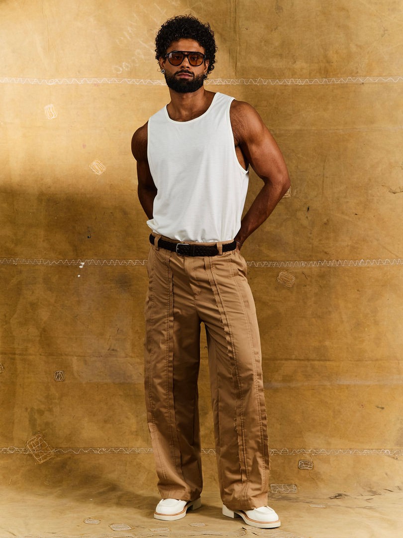 A Calça Masculina Dune foi desenvolvida para homens que buscam peças inovadoras e marcantes no guarda-roupa. Seu design exclusivo conta com recortes sobrepostos na parte frontal, que criam um efeito moderno e estruturado.